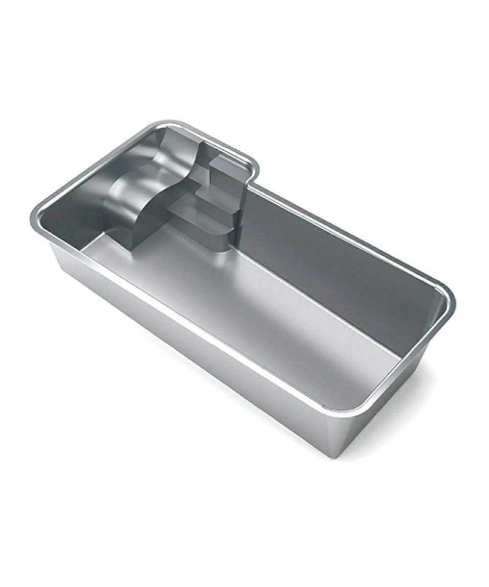El vaso de piscina presenta forma rectangular con una escalera de tres peldaños en paralelo a una tumbona en uno de los laterales. La escalera está integrada en el propio vaso. La profundidad aumenta según el eje longitudinal desde la base de la escalera. La coronacion perimetral integrada en el vaso es de 10 cm de anchura. Los paramentos verticales, salvo en la escalera, son continuos desde la coronación al fondo de la piscina (sin rebordes interiores).